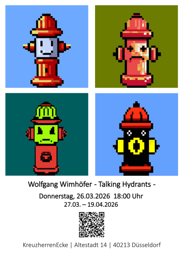 In der KreuzherrenEcke wird das Projekt Talking Hydrants in einer direkten Verbindung von analoger Präsentation und digitalem Archiv gezeigt. Hydrantenbilder, KI-generierte Transformationen und NFT-Bezüge werden parallel erfahrbar gemacht.